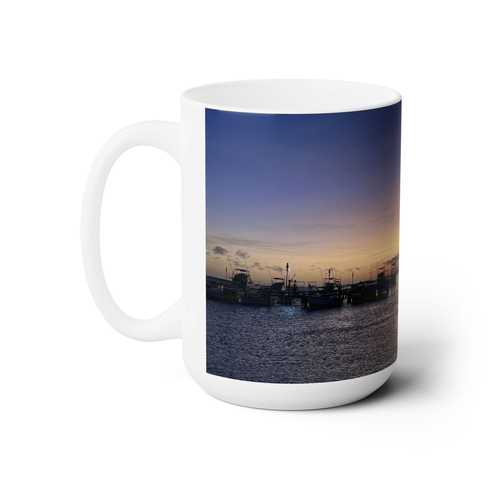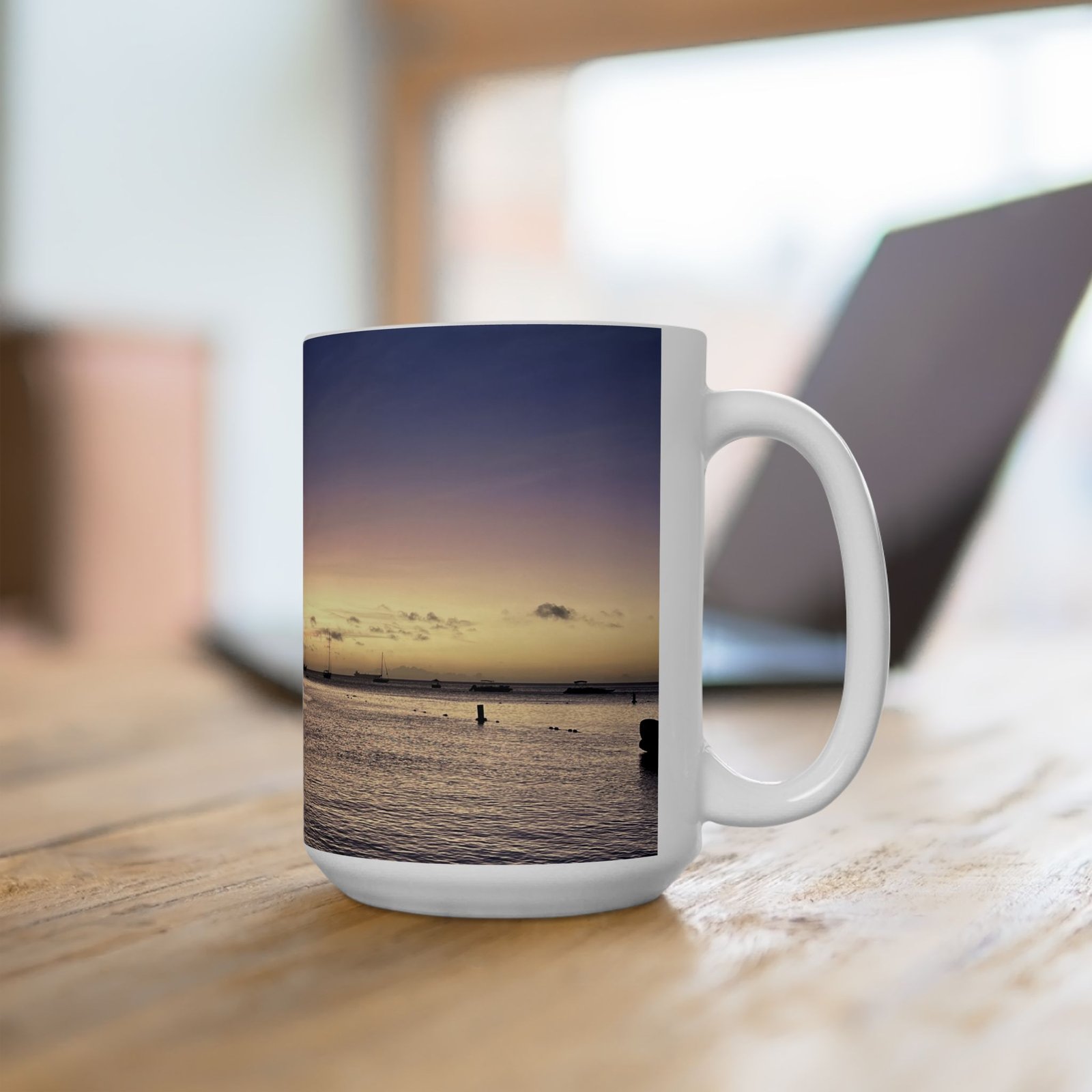 Large 15-ounce custom mug. It’s microwave-safe, and can be washed in the dishwasher or easily cleaned with a mild detergent.
